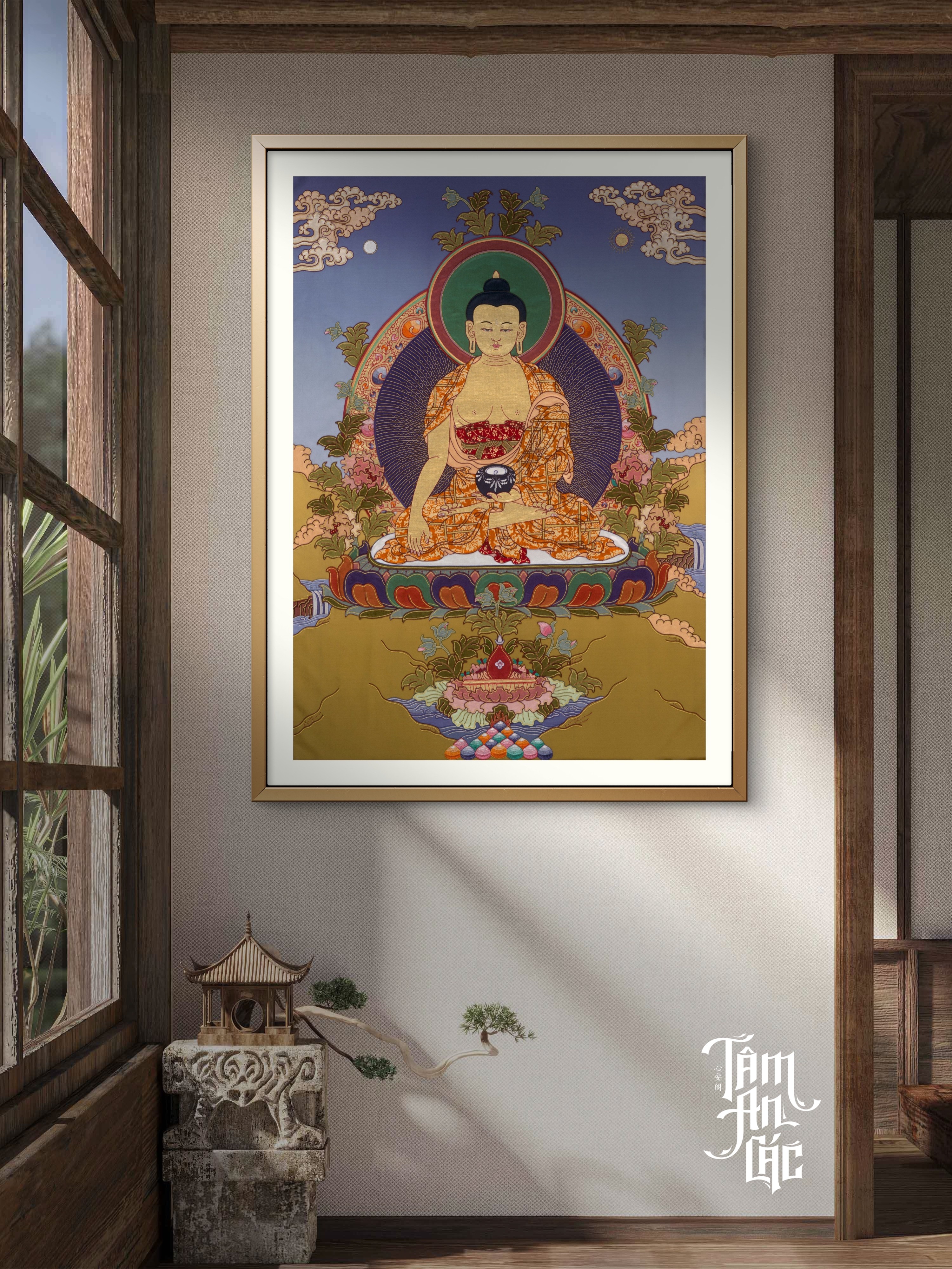 Đức Thích Ca an tọa giữa bầu trời chuyển sắc từ lam sang tím, hai biểu tượng Nhật – Nguyệt soi chiếu đôi bờ tỉnh thức. Tấm y vàng rực phủ thành từng lớp ánh sáng, bao bọc thân Ngài trong sự tỏa rạng tĩnh lặng. Một khoảnh khắc Đại Định hiển hiện — nhẹ, sáng, thuần minh.