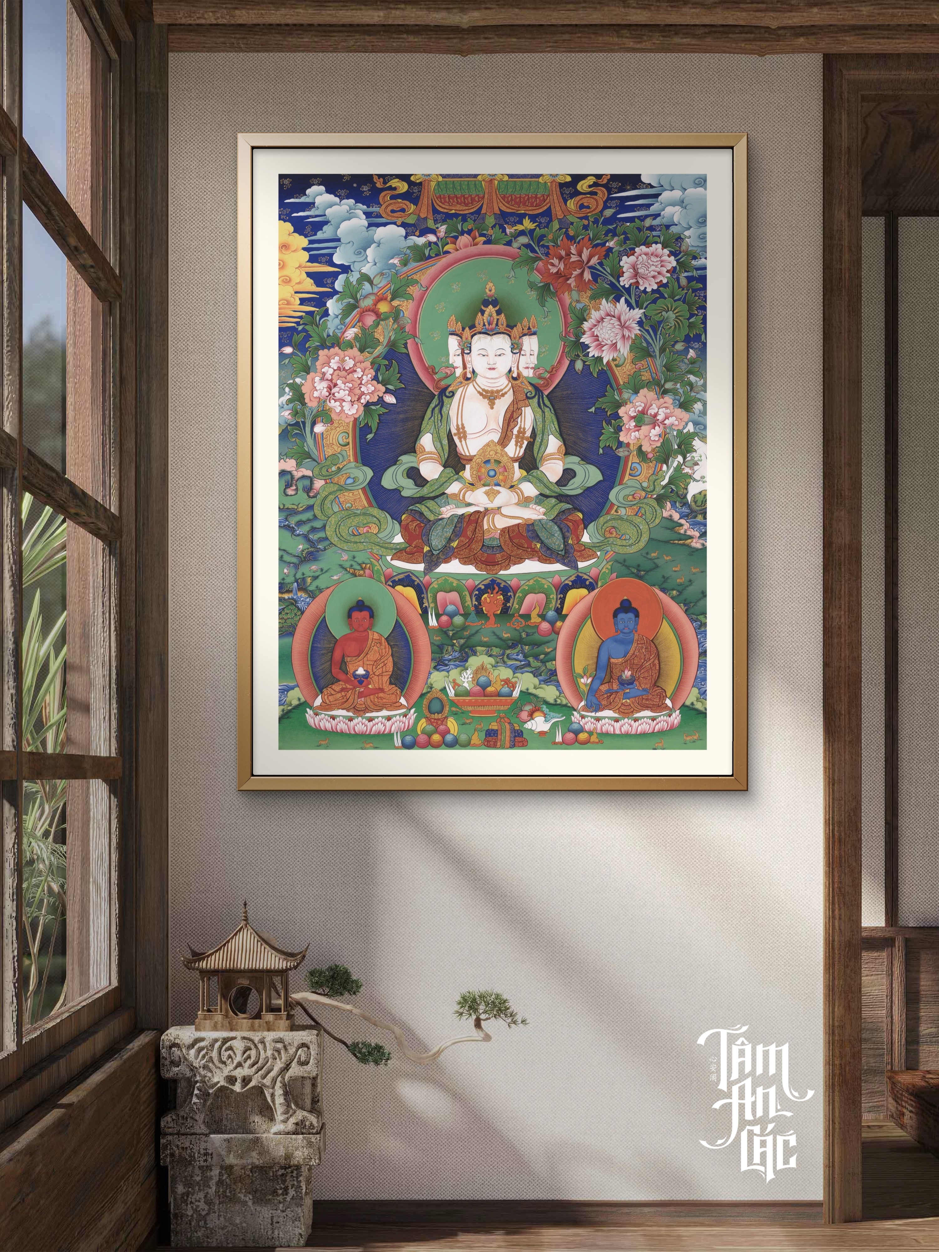 Đại Nhật Như Lai – trung tâm của Ngũ Trí Như Lai, thân trắng quang minh, tĩnh tọa giữa mandala hoa mây, biểu trưng cho Trí tuệ Pháp giới chiếu khắp. Bốn mặt – một tâm – soi trọn mọi phương diện thực tại. Hai Phật phương hộ phía dưới mở thành thế tam-đồ năng lượng: trí – bi – tịnh hóa, nâng tâm người xem vào một trường sáng rộng và an.