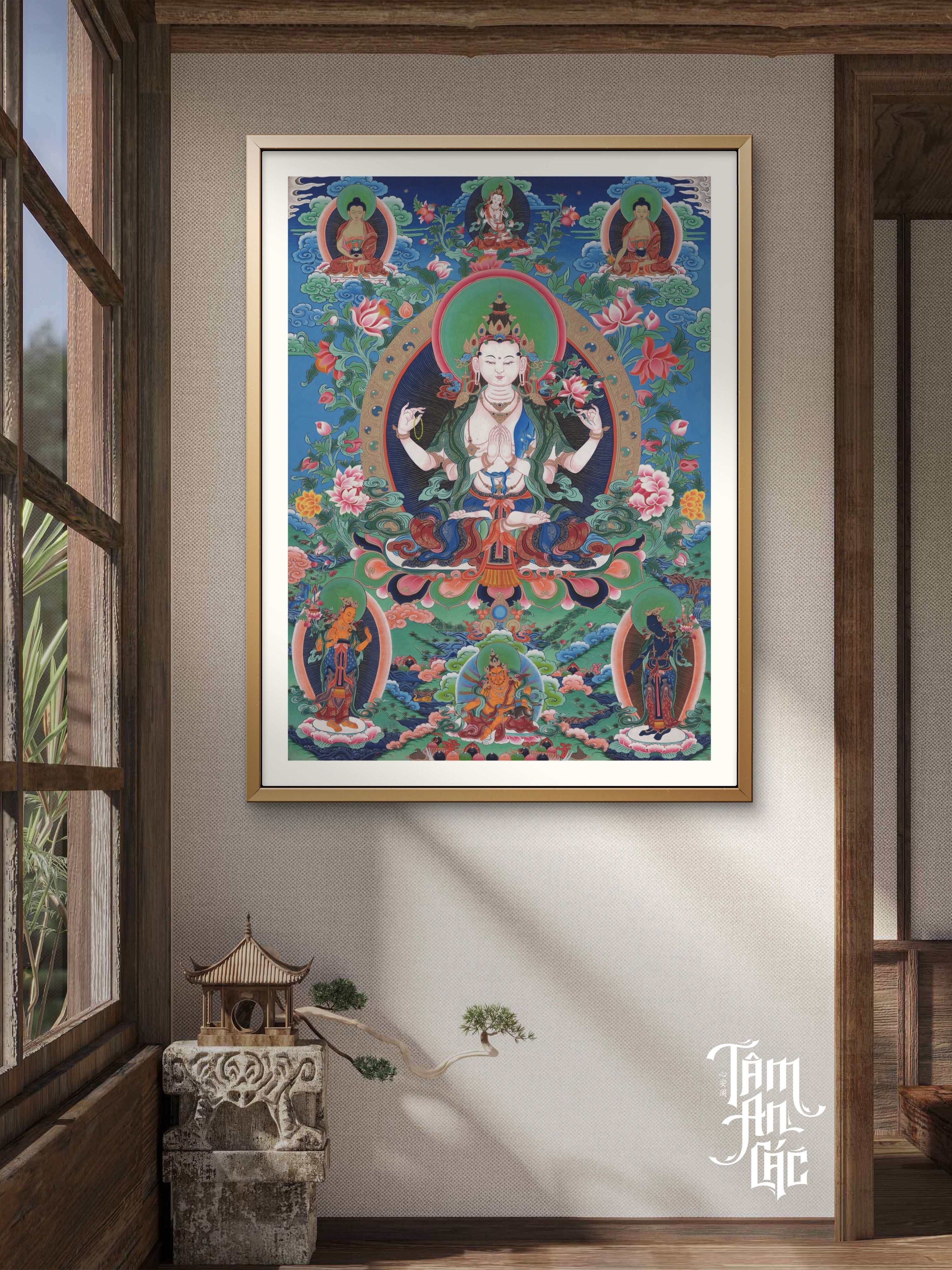 Một bố cục tôn nghiêm, sáng mở như một cõi tịnh vô lượng: Bạch Quán Thế Âm hiển hiện trong sắc thân thanh tịnh, bốn tay tiếp dẫn, nâng hoa sen và lần tràng châu. Hào quang xanh–đỏ bao trùm, hoa sen nở khắp hư không, hai vị hộ tôn an trú bên dưới, toàn cảnh gợi nên nhịp thở từ bi sâu lắng.