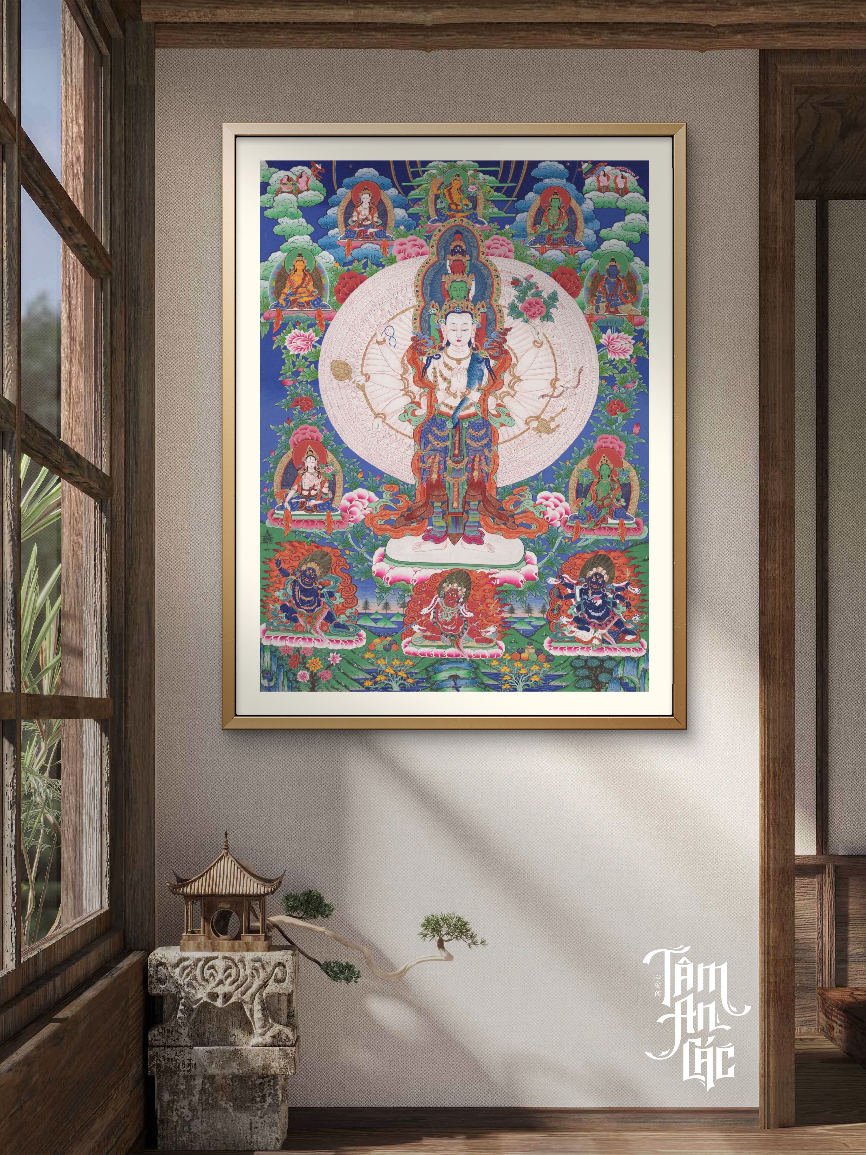 Thiên Thủ Thiên Nhãn Quán Thế Âm, biểu tượng tối thượng của tâm từ bi vô lượng, hiện trong hình tướng nghìn tay nghìn mắt – trí tuệ thấy biết, hành động cứu độ không ngừng. Tác phẩm kết hợp sắc lục, lam, đỏ và hoàng kim theo truyền thống Menri, tạo nên một mandala từ – trí – lực hòa mãn, dẫn mắt người xem về trung tâm thanh tịnh của Ngài.