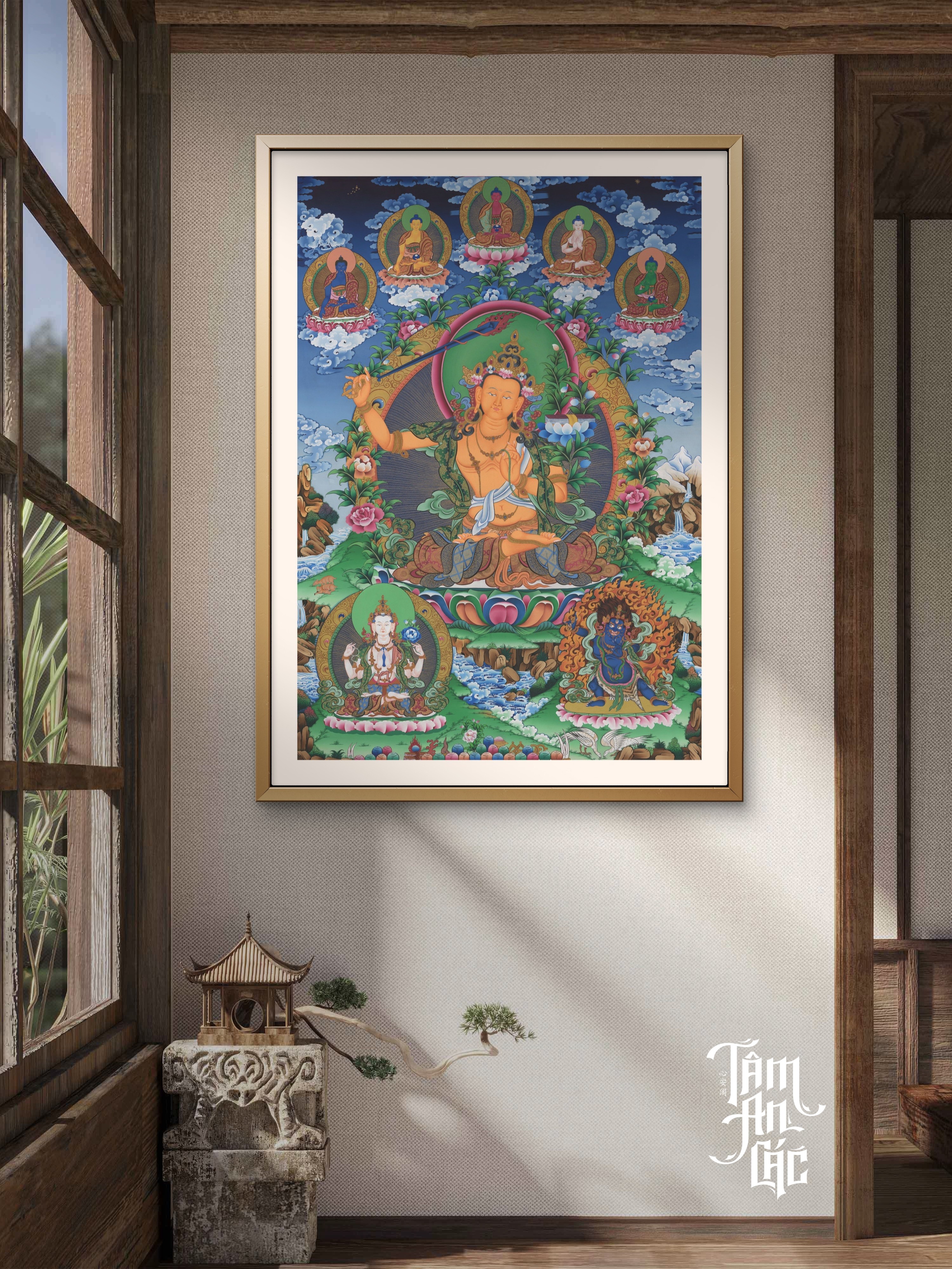Văn Thù Sư Lợi an tọa giữa tầng mây lam – liên hoa rực sắc Tạng truyền, tay nâng kiếm trí Bát Nhã phá tan vô minh, tay trái trì hoa sen đặt kinh. Trên cao, bảy vị Phật tọa mây gia trì ánh sáng giác ngộ. Tác phẩm tạo nên một trường khí sáng – tĩnh – khai tuệ, dẫn người xem trở về vùng tâm minh triệt.