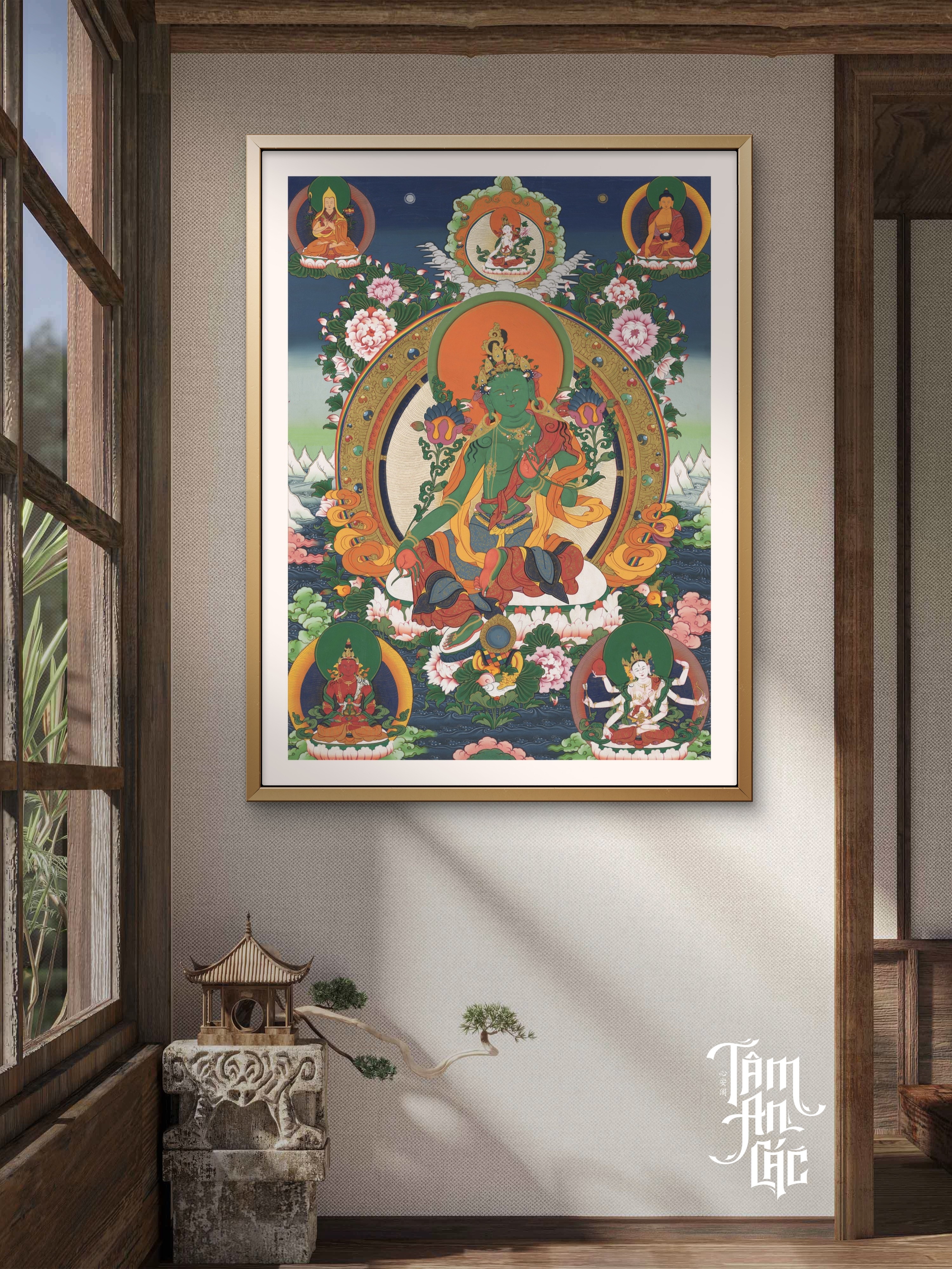 Tara Lục Độ hiện trong sắc lục mềm dịu, chân duỗi biểu trưng ứng hiện tức thì, tay ban vô úy mở lối thoát khỏi hiểm nạn. Mandala hoa sen – mây – bản tôn hộ trì tạo một trường lực từ mẫu, nâng đỡ và làm dịu tâm người xem. Bức tranh thể hiện tinh thần cứu khổ nhanh chóng, sáng và dịu như hơi thở Tara.