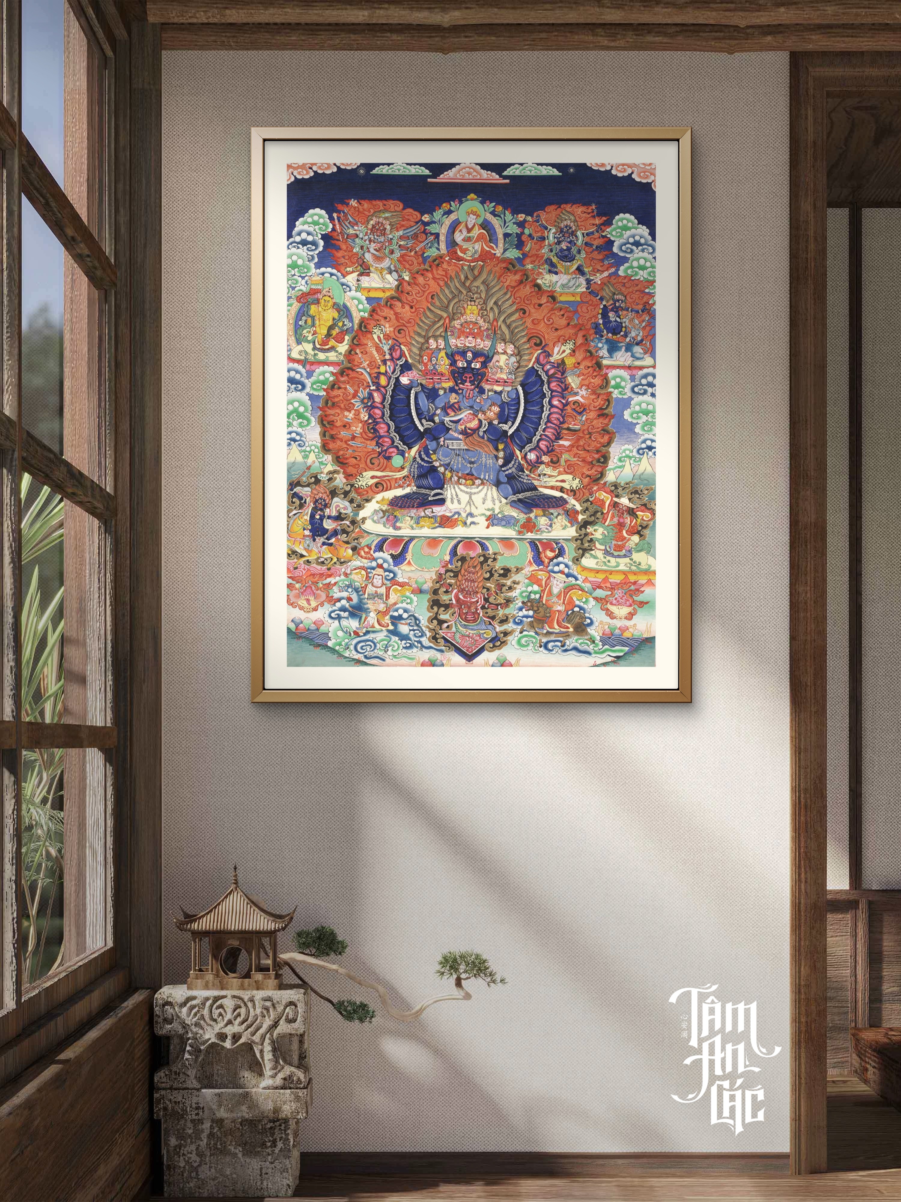 Ngắm Yamantaka, ta nhận ra sức mạnh không nằm ở tiếng gào, mà ở độ trong của trí tuệ. Oai tướng phẫn nộ chỉ là hình tướng của tâm đại bi khi đối diện với vô minh cứng dày. Trong vòng lửa đỏ, từng đường nét như đang nhắc ta rằng: muốn vượt thoát, phải đủ can đảm nhìn thẳng vào chính bóng tối của mình.
