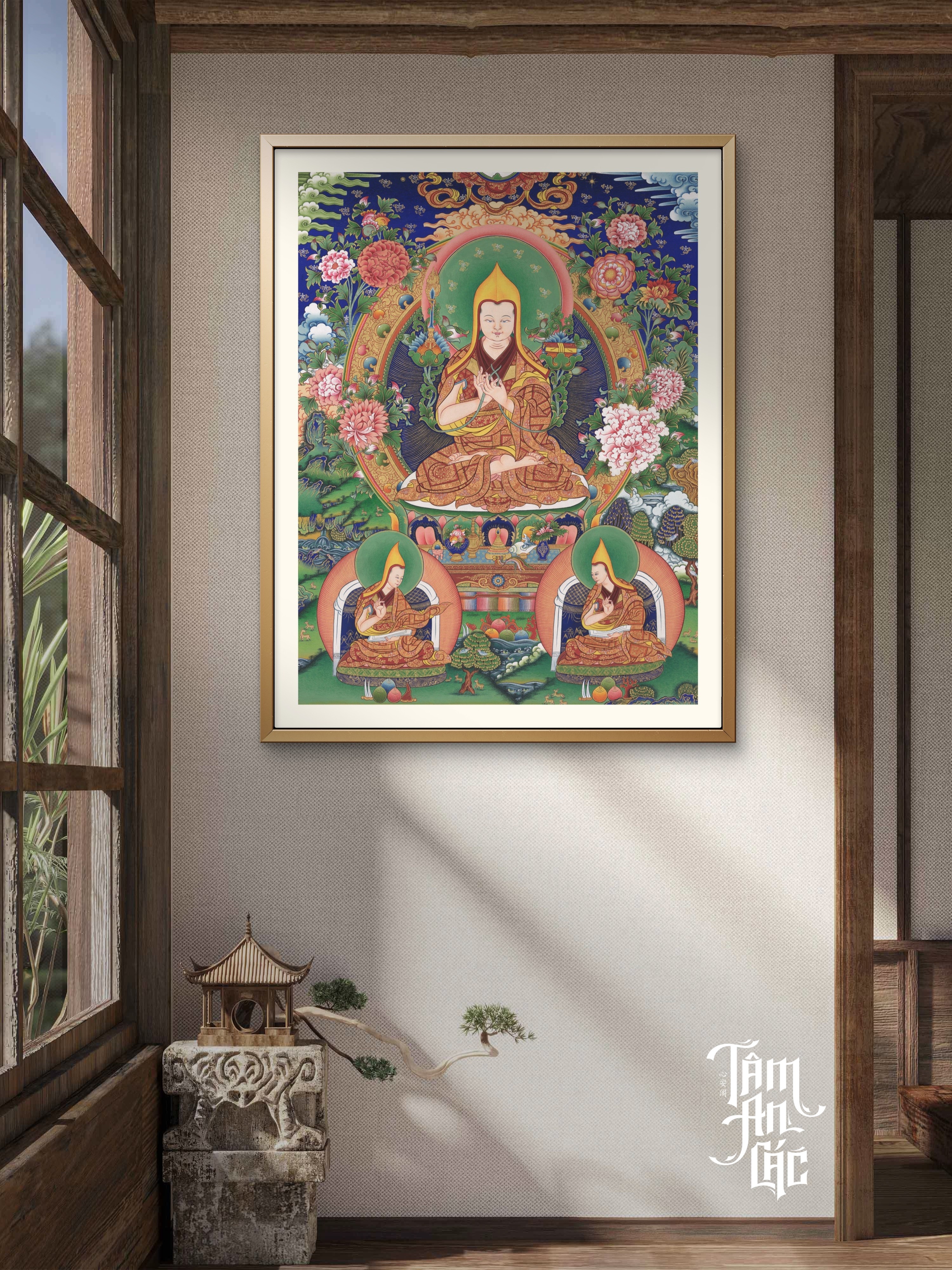 Vị Lama ở trung tâm chính là Ngài Tông-khách-ba (Tsongkhapa, 1357–1419) là một bậc đại thiền giả, nhà triết học và đạo sư vĩ đại, người có công lớn trong việc chấn hưng và hệ thống hóa Phật giáo Tây Tạng. còn goi là sư tổ người sáng lập trường phái Gelug ("Mũ Vàng"), là một trong bốn tông phái lớn nhất và có ảnh hưởng nhất của Phật giáo Tây Tạng hiện nay. Ngài được tôn xưng là hóa thân của Bồ Tát Văn Thù Sư Lợi (Manjushri), biểu tượng của trí tuệ.