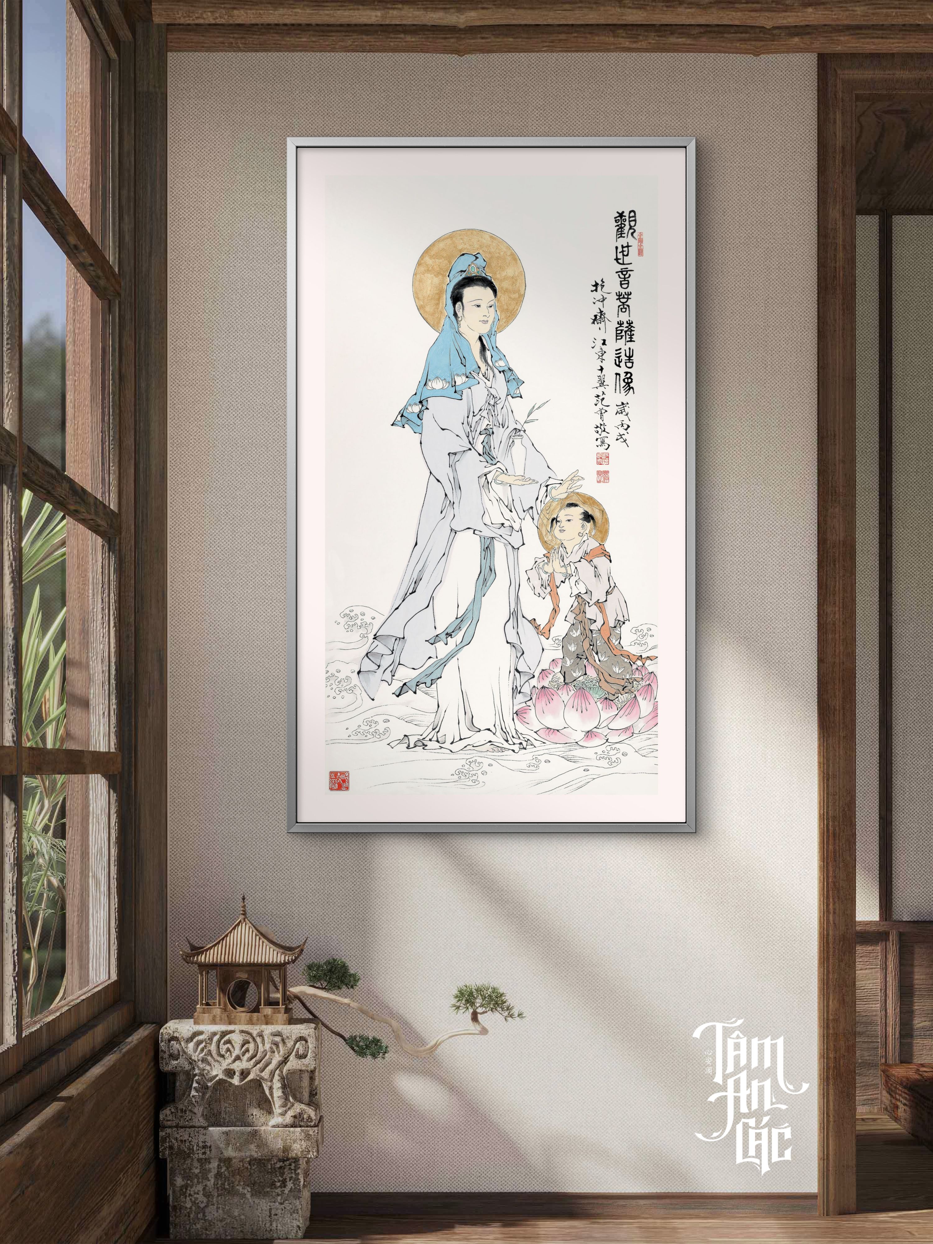 Bức tranh thể hiện Bồ Tát Quan Thế Âm đứng trên sóng nước bên cạnh là đồng tử Thiện Tài chắp tay kính lễ. Thiện Tài Đồng Tử được coi là đệ tử và thị giả của Bồ Tát Quan Thế Âm, Đồng tử Thiện Tài là biểu trưng cho quá trình cầu học và thực hành Bồ tát đạo.