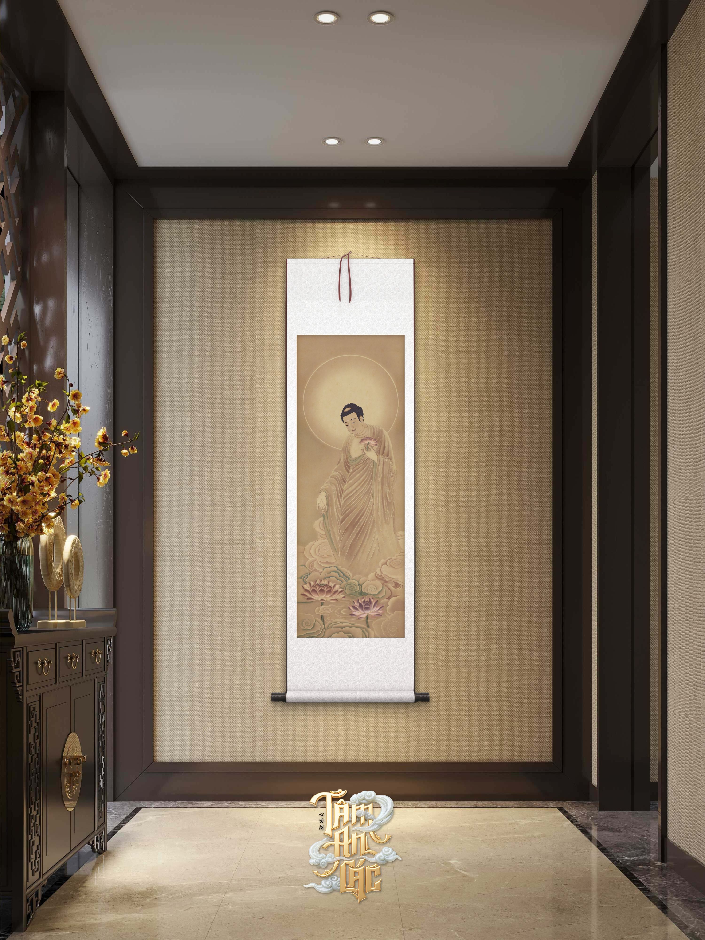 Bức họa gợi lên cảm giác như đang đứng giữa một lớp sương hồng, nơi mọi dao động lắng xuống. Từ ánh mắt và bàn tay của Ngài, một ý niệm rất nhẹ được gửi tới người xem: “Chỉ cần một niệm thiện lành, con đã bước lên đoá sen của chính mình.” Không phải lời dạy, mà là sự hiện diện của Đức Phật trên bức tranh.
