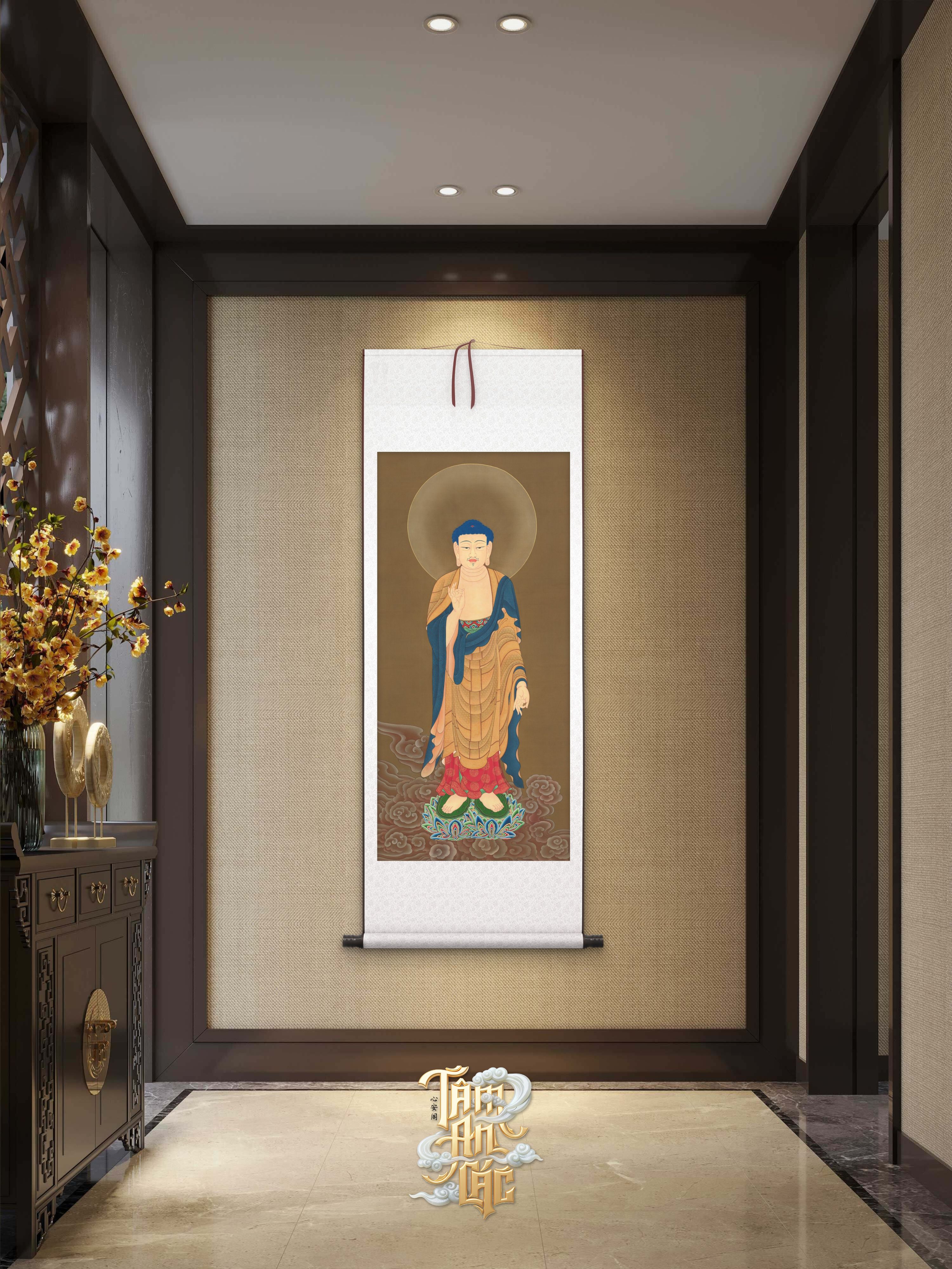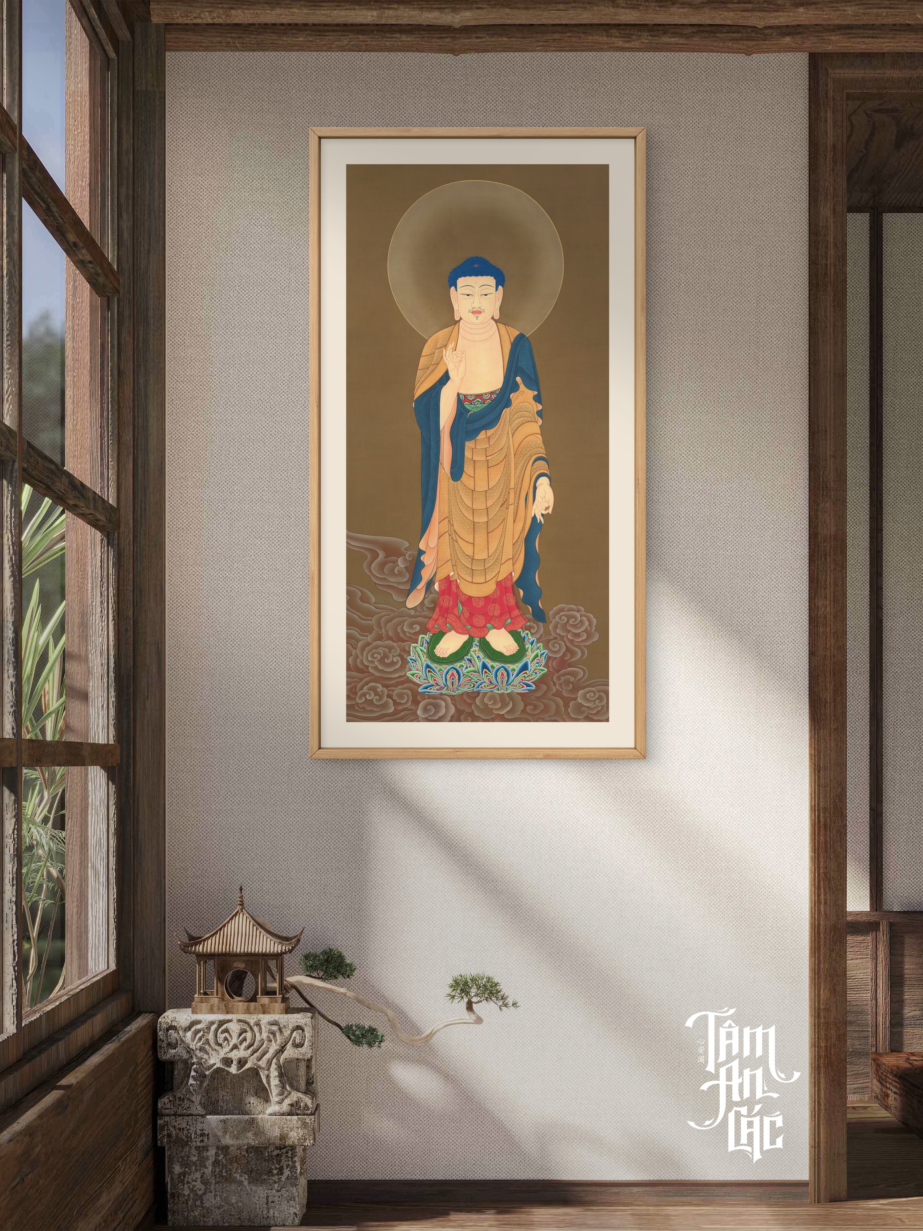1. Dáng đứng tiếp dẫn – biểu tượng của sự đón nhận, bức tranh khắc họa Đức Phật A Di Đà trong tướng đứng tiếp dẫn – một hình tướng quen thuộc của truyền thống Tịnh Độ. Tay phải ban sự không sợ hãi, giúp tâm người trở nên vững vàng. Tay trái buông nhẹ, mở ra một cánh cửa đưa con người trở về sự bình an. Đôi mắt khép nhẹ, thần sắc mềm mại. Áo vàng – lam nhiều lớp uốn nhẹ như gió, mang phong vị hội họa Đường–Tống: nhã, tinh tế, không phô diễn.